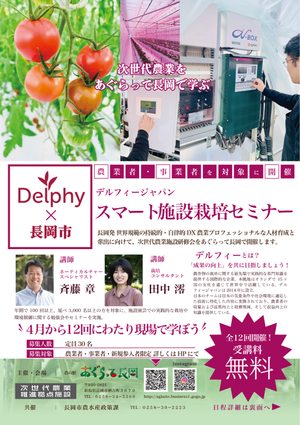デルフィージャパンスマート施設栽培セミナー / 研修・イベント / By 髙橋亮太 デルフィージャパンスマート施設栽培セミナー デルフィージャパンスマート施設栽培セミナー セミナー参加者は、長岡市内で農業をしている方、長岡市内に事業所がある方に限ります。 長岡発、世界規範の持続的・自律的DX農業プロフェッショナルな人材育成と輩出に向けて、次世代農業施設研修会を開催します。 日程 2025年4月から毎月1回開催(全12回) 参加費 無料 定員 各日程30名 持ち物 筆記用具 セミナー内容 座学及びスマート園芸施設における実地研修です。 申し込む